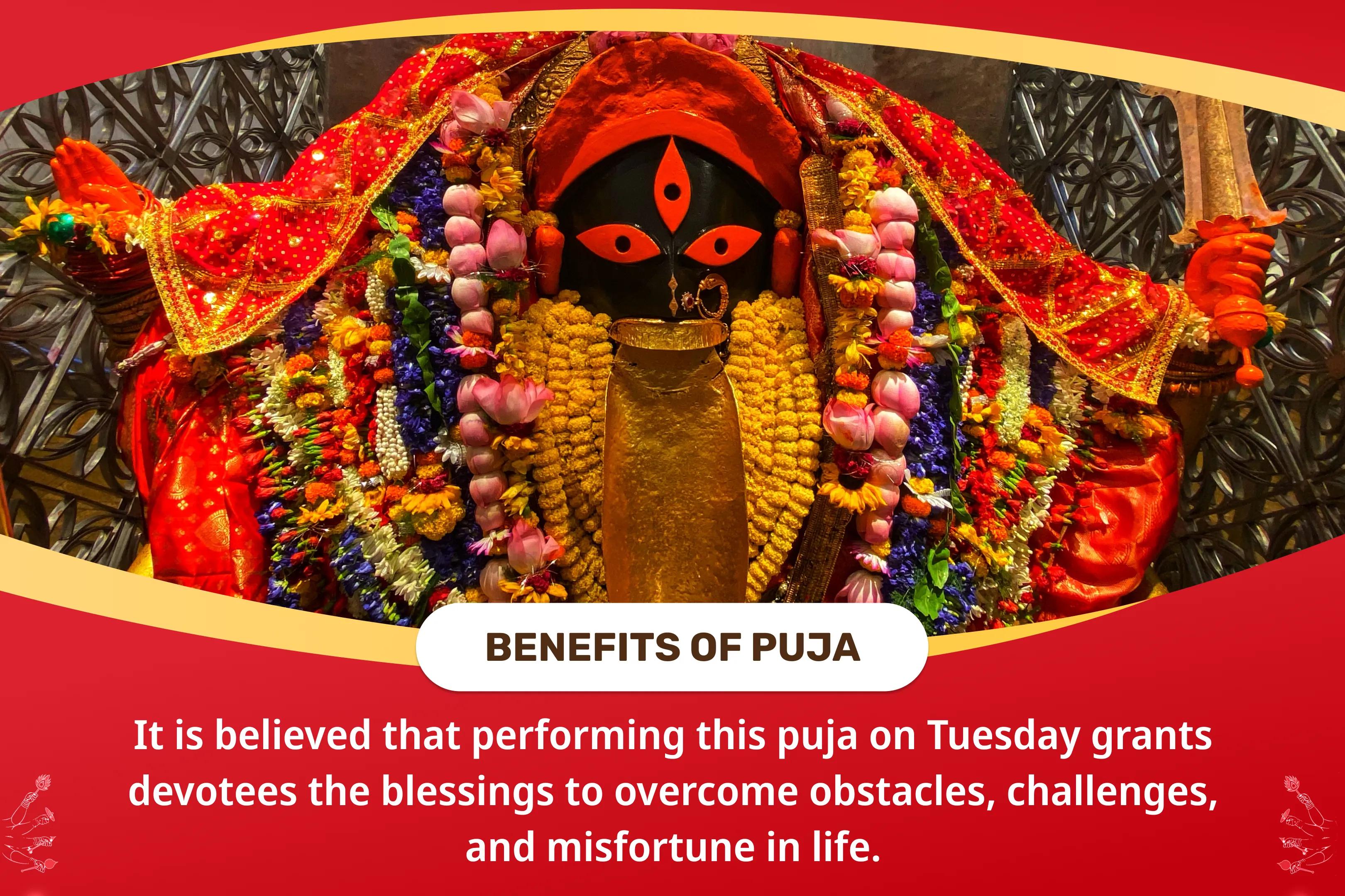 It is believed that Maha Kali and Shri Hanuman Karya Siddhi Pujan along with Mangal Shanti Yagya on Tuesday grants devotees the power to overcome misfortune. The intense energy of Maa Kali and the divine strength of Lord Hanuman work together to eliminate negative circumstances, paving the way for happiness, prosperity, and success. This puja is also believed to pacify the malefic effects of Mars, bringing peace and positivity into life.