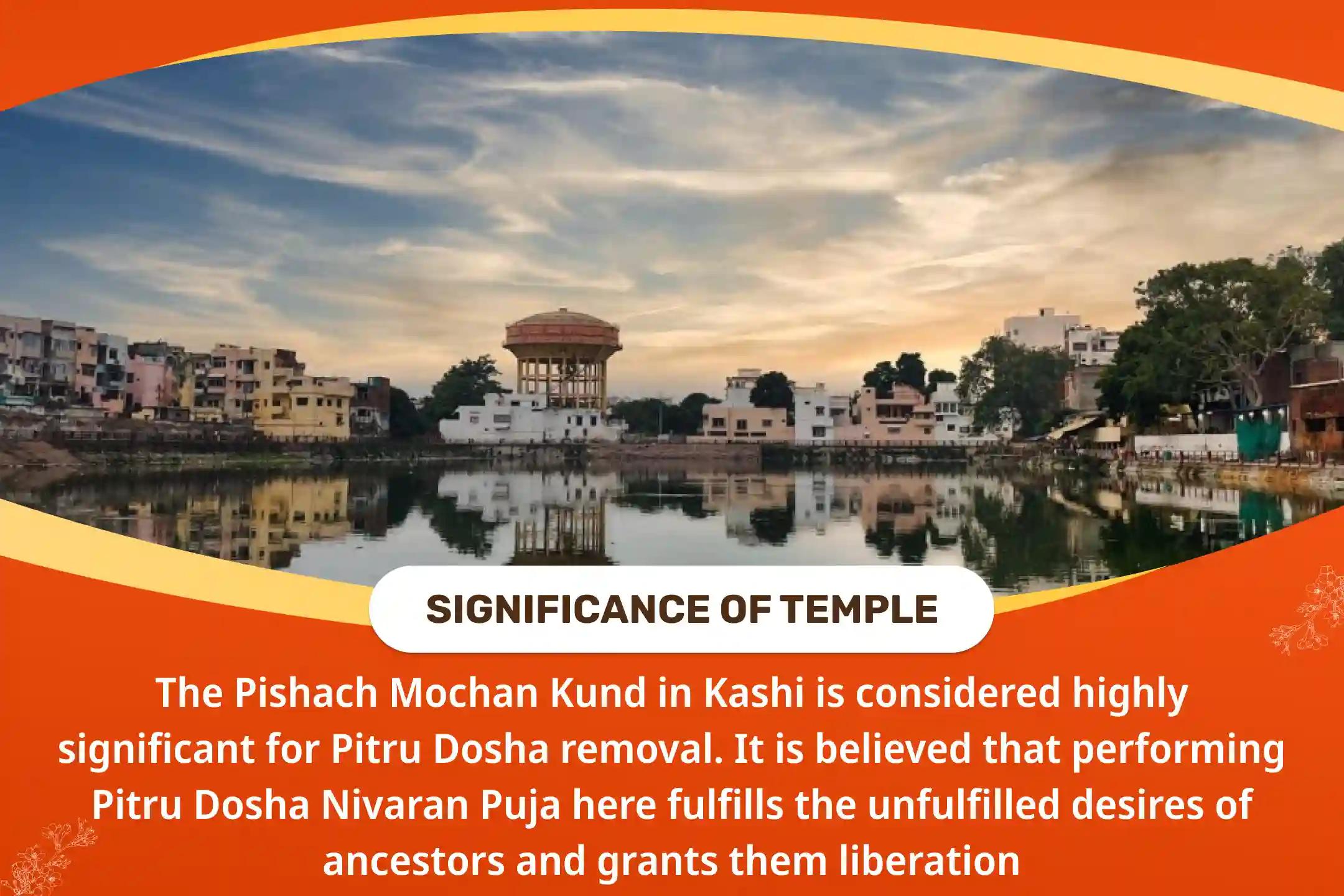 In the mystical realm of Kashi, the city of salvation, tranquillity befalls the departed souls. The belief echoes that drawing the last breath here leads to liberation, drawing numerous seekers to make Kashi their final abode. At the heart of this spiritual haven lies the revered Pishach Mochan Kund, where Pitru Dosh Shanti Mahapuja takes place. Here, the unfulfilled desires of ancestors find fulfilment, paving the way for their ultimate liberation.