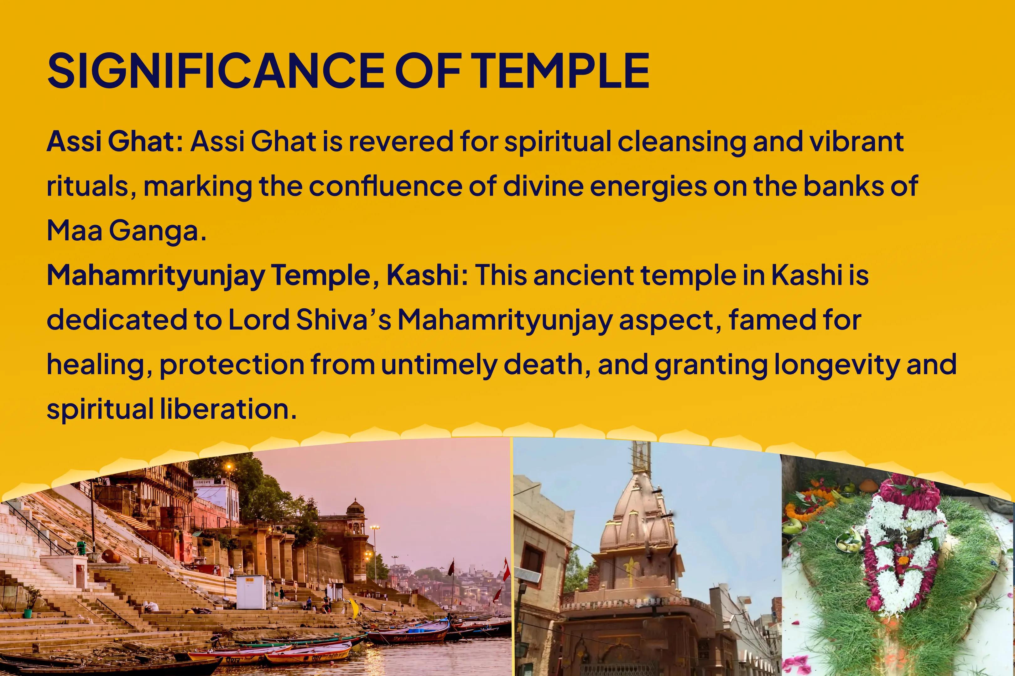 In Kashi, the eternal city of Lord Shiva, two sacred sites stand out for their deep spiritual and healing power—Shri Mahamrityunjay Mahadev Temple and Assi Ghat. The Mahamrityunjay Temple, located in the northeast part of Kashi, is dedicated to Lord Shiva’s death-conquering form. This temple is believed to be over a thousand years old and houses a self-manifested Shivling. Within its premises lies the Dhanvantari Koop, a sacred well infused—according to legend—by Lord Dhanvantari himself with potent herbs and healing energy. Devotees believe that the water from this well cures chronic illnesses and protects against untimely death. Every year, thousands visit this temple to perform Mahamrityunjay Jaap and seek health, longevity, and divine protection.
