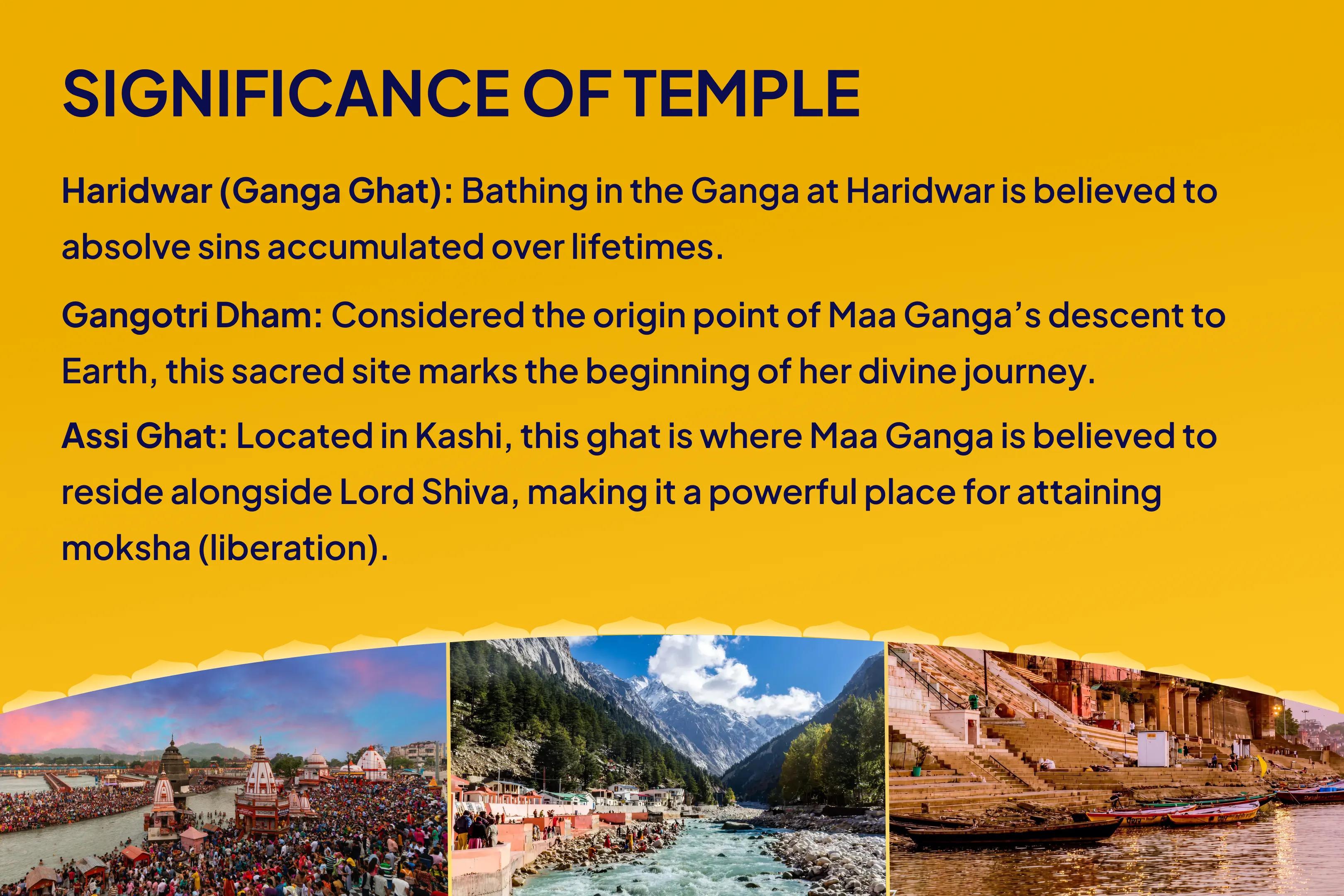 Ganga Ghat (Haridwar), Assi Ghat (Kashi), Ganga Ghat (Gangotri Dham), Haridwar, Kashi (Varanasi), Gangotri Dham