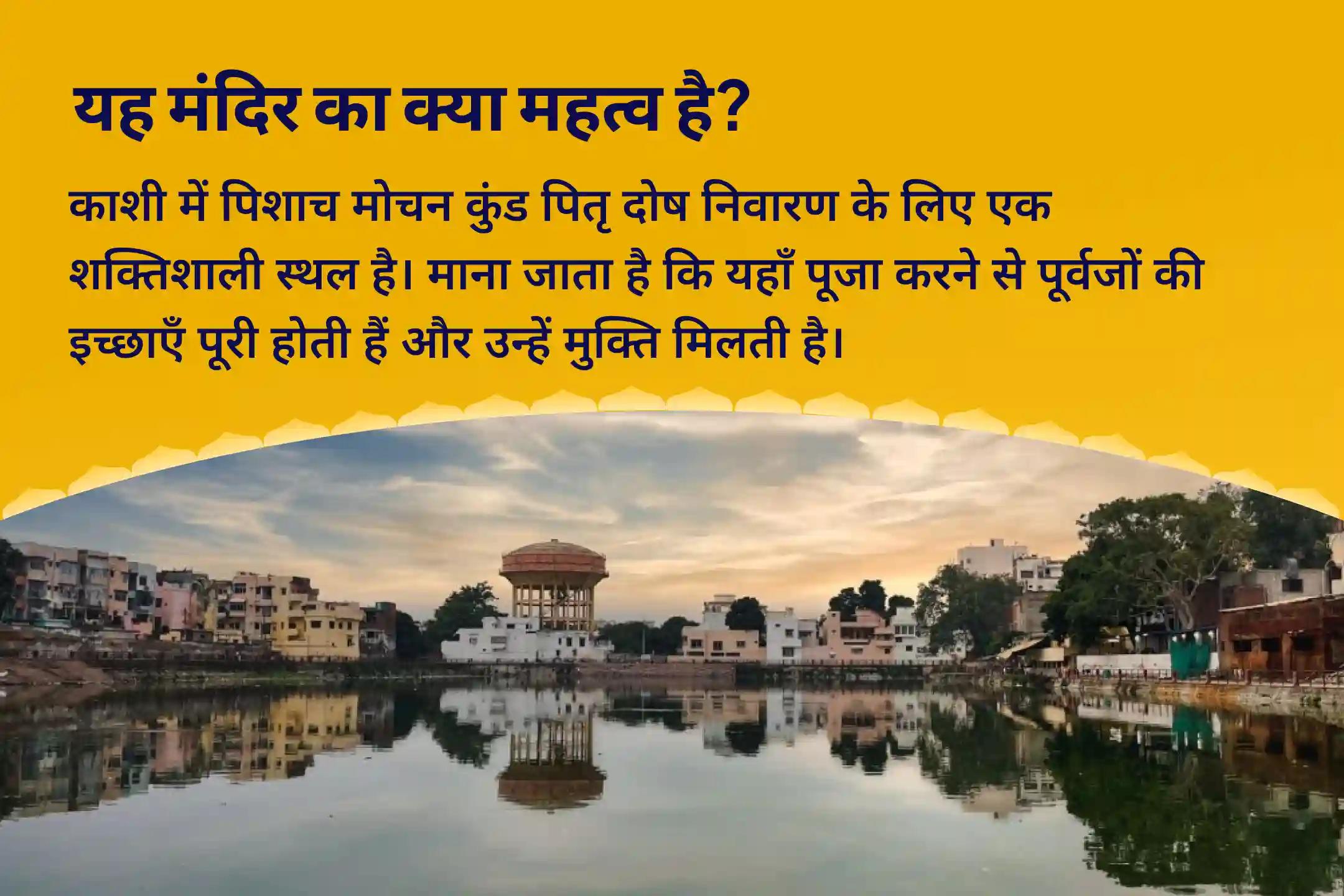 рдореЛрдХреНрд╖ рдХреА рдирдЧрд░реА рдХрд╛рд╢реА рдХреЛ рдкрд┐рддреГ рд╢рд╛рдВрддрд┐ рдФрд░ рдореЛрдХреНрд╖ рдкреНрд░рд╛рдкреНрддрд┐ рдХрд╛ рдкрд░рдо рддреАрд░реНрде рдорд╛рдирд╛ рдЧрдпрд╛ рд╣реИред рдорд╛рдиреНрдпрддрд╛ рд╣реИ рдХрд┐ рдЬреЛ рд╡реНрдпрдХреНрддрд┐ рдХрд╛рд╢реА рдореЗрдВ рдЕрдВрддрд┐рдо рд╕рд╛рдВрд╕ рд▓реЗрддрд╛ рд╣реИ, рдЙрд╕реЗ рдореЛрдХреНрд╖ рдХреА рдкреНрд░рд╛рдкреНрддрд┐ рд╣реЛрддреА рд╣реИред рдпрд╣реА рдХрд╛рд░рдг рд╣реИ рдХрд┐ рдЕрдиреЗрдХ рд╢реНрд░рджреНрдзрд╛рд▓реБ рдЕрдкрдиреЗ рдЬреАрд╡рди рдХреЗ рдЕрдВрддрд┐рдо рд╕рдордп рдореЗрдВ рдпрд╣рд╛рдВ рдЖрдХрд░ рдмрд╕ рдЬрд╛рддреЗ рд╣реИрдВред рдХрд╛рд╢реА рдореЗрдВ рд╕реНрдерд┐рдд рдкрд┐рд╢рд╛рдЪ рдореЛрдЪрди рдХреБрдВрдб рдХреЛ рдкрд┐рддреГ рджреЛрд╖ рд╢рд╛рдВрддрд┐ рдХреЗ рд▓рд┐рдП рд╡рд┐рд╢реЗрд╖ рд╕реНрдерд╛рди рдкреНрд░рд╛рдкреНрдд рд╣реИред рдЧрд░реБрдбрд╝ рдкреБрд░рд╛рдг рдФрд░ рдХрд╛рд╢реА рдЦрдВрдб рдореЗрдВ рдЗрд╕рдХрд╛ рдЙрд▓реНрд▓реЗрдЦ рдорд┐рд▓рддрд╛ рд╣реИ, рдЬрд╣рд╛рдВ рдпрд╣ рдмрддрд╛рдпрд╛ рдЧрдпрд╛ рд╣реИ рдХрд┐ рдЗрд╕ рдХреБрдВрдб рдореЗрдВ рдкрд┐рдВрдбрджрд╛рди, рддрд░реНрдкрдг рдФрд░ рдкрд┐рддреГ рджреЛрд╖ рдирд┐рд╡рд╛рд░рдг рдкреВрдЬрд╛ рдХрд░рдиреЗ рд╕реЗ рдкрд┐рддрд░реЛрдВ рдХреА рдЕрдзреВрд░реА рдЗрдЪреНрдЫрд╛рдПрдВ рдкреВрд░реНрдг рд╣реЛрддреА рд╣реИрдВ рдФрд░ рдЙрдиреНрд╣реЗрдВ рд╢рд╛рдВрддрд┐ рдПрд╡рдВ рдореБрдХреНрддрд┐ рдкреНрд░рд╛рдкреНрдд рд╣реЛрддреА рд╣реИред