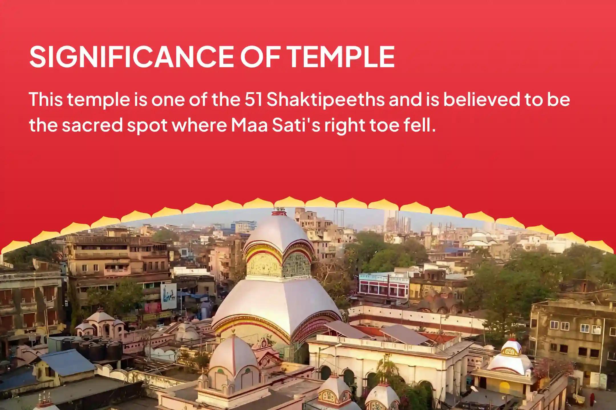 The current temple was constructed under the patronage of the Saborno Roychoudhury family & Babu Kaliproshad Dutto, with construction starting in 1798 and completing in 1809. The Kali Ghat Temple holds immense religious and cultural significance. For centuries, it has been a centre of attraction for devotees who come here to fulfil their wishes. Worship of Goddess Kali at Kalighat liberates devotees from fear, negativity, and malevolent energies, bringing peace, prosperity, and success in life. Additionally, the temple is a symbol of Bengal's cultural heritage and hosts grand celebrations during religious festivals, especially Durga Puja and Kali Puja.