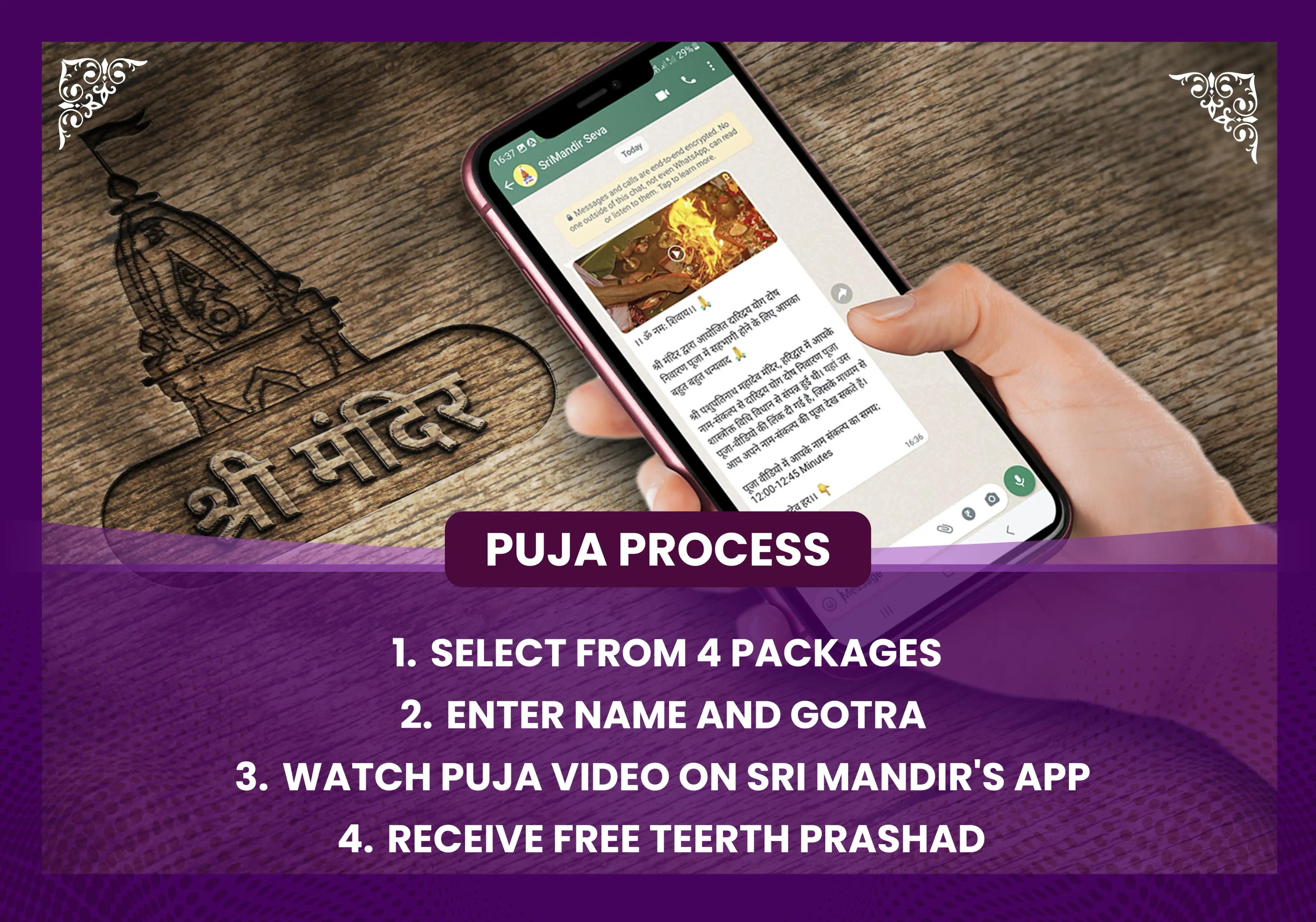The video of your Puja, completed with your name and Gotra, will be shared on WhatsApp.