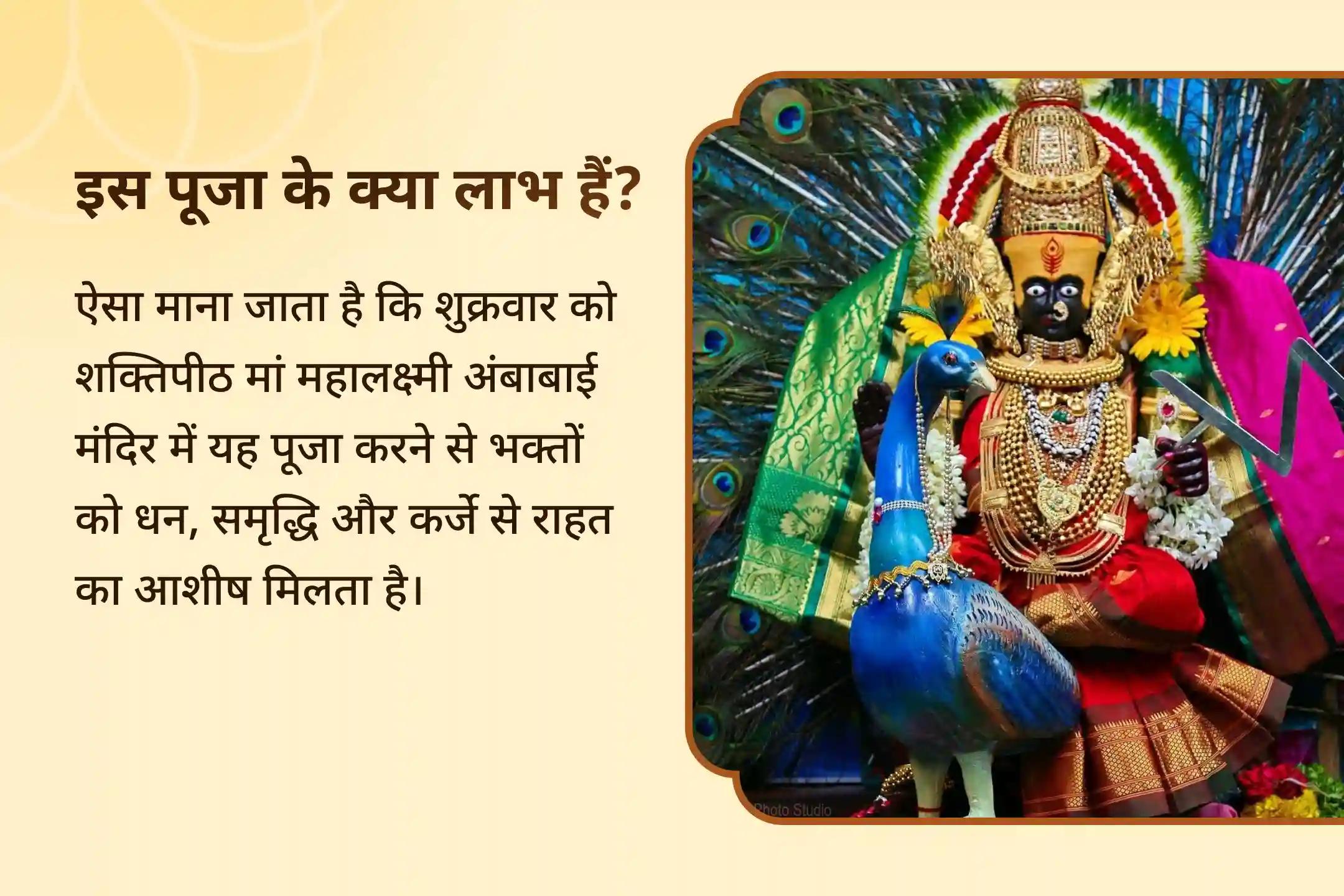 शक्तिपीठ अंबाबाई महालक्ष्मी मंदिर में शुक्रवार को विशेष धन और समृद्धि पूजा एवं यज्ञ करने से माता लक्ष्मी की दिव्य कृपा प्राप्त हो सकती है, जो धन, प्रसिद्धि और सुख-समृद्धि का स्रोत बनने में सहायक मानी जाती है।