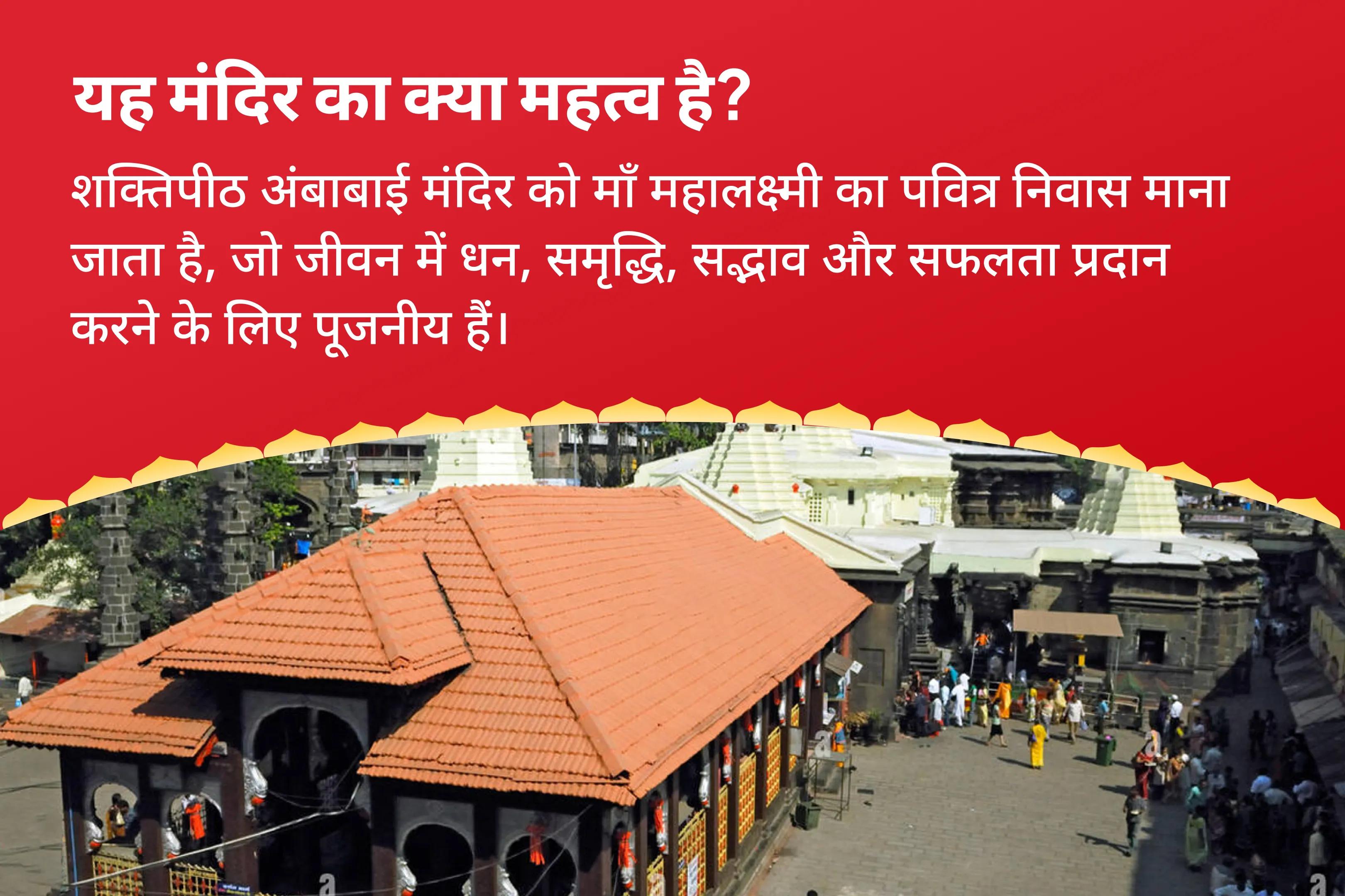 महाराष्ट्र के कोल्हापुर में स्थित श्री महालक्ष्मी अंबाबाई मंदिर भारत के प्रमुख शक्तिपीठों में से एक है। पौराणिक कथा के अनुसार देवी सती के दो नेत्र इसी स्थान पर गिरे थें तब से माता लक्ष्मी यहां विराजमान हैं। 7000 साल से भी अधिक पुराने इस मंदिर में विराजित माता लक्ष्मी की मूर्ति को दिव्य एवं चमत्कारी माना जाता है। साल में दो बार सूर्य की किरणें सीधे माता लक्ष्मी के चरणों पर पहुंचती है। इस दौरान यहां किरणोत्सव त्योहार मनाया जाता है। इस मंदिर में विराजित माता लक्ष्मी, अपने भक्तों के घर-परिवार एवं व्यवसाय में पैसे की तंगी तथा दरिद्रता को नष्ट कर देती है। कहते हैं इस मंदिर में सच्चे मन से पूजा-अर्चना करने से माता लक्ष्मी अपने भक्तों की सारी इच्छाएं पूरी करती हैं। यही कारण है कि आर्थिक समृद्धि बनाए रखने के लिए श्री महालक्ष्मी अंबाबाई मंदिर में की जाने वाली पूजा का महत्व अधिक है।