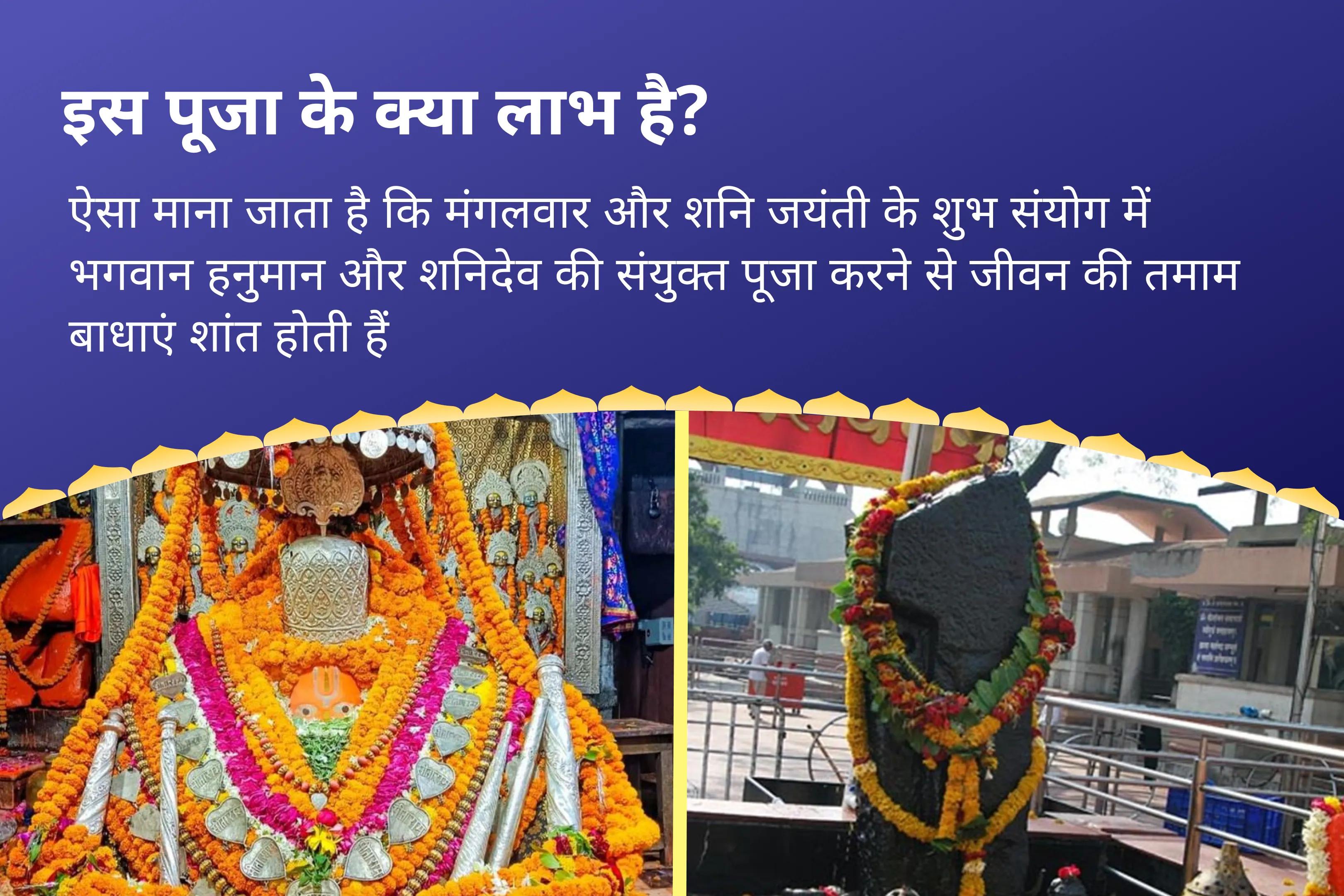 рднрдЧрд╡рд╛рди рд╣рдиреБрдорд╛рди рдХреЛ рдЕрдкрд╛рд░ рд╢рдХреНрддрд┐, рдЕрдЯреВрдЯ рднрдХреНрддрд┐ рдФрд░ рд╕рдВрдХрдЯрдореЛрдЪрди рд╕реНрд╡рд░реВрдк рдХреЗ рд▓рд┐рдП рдкреВрдЬрд╛ рдЬрд╛рддрд╛ рд╣реИред рдЙрдиреНрд╣реЗрдВ рдХрд▓рд┐рдпреБрдЧ рдХрд╛ рдЪрд┐рд░рдВрдЬреАрд╡реА рджреЗрд╡рддрд╛ рдорд╛рдирд╛ рдЧрдпрд╛ рд╣реИ, рдЬреЛ рд╕рдЪреНрдЪреЗ рдорди рд╕реЗ рдХреА рдЧрдИ рдкреНрд░рд╛рд░реНрдердирд╛ рдХрд╛ рд╢реАрдШреНрд░ рдЙрддреНрддрд░ рджреЗрддреЗ рд╣реИрдВред рд╡рд┐рд╢реЗрд╖ рд░реВрдк рд╕реЗ рдордВрдЧрд▓рд╡рд╛рд░ рдХрд╛ рджрд┐рди рдЙрдирдХреА рдЖрд░рд╛рдзрдирд╛ рдХреЗ рд▓рд┐рдП рдЕрддреНрдпрдВрдд рд╢реБрдн рдорд╛рдирд╛ рдЧрдпрд╛ рд╣реИред рд╡рд╣реАрдВ рд╢рдирд┐рджреЗрд╡ рдХреЛ рдХрд░реНрдордлрд▓ рджрд╛рддрд╛ рдХрд╣рд╛ рдЬрд╛рддрд╛ рд╣реИ, рдЬреЛ рдЬрд╛рддрдХ рдХреЛ рдЙрд╕рдХреЗ рдХрд░реНрдореЛрдВ рдХреЗ рдЕрдиреБрд╕рд╛рд░ рдлрд▓ рдкреНрд░рджрд╛рди рдХрд░рддреЗ рд╣реИрдВред рдЗрд╕ рдмрд╛рд░ рдХрд╛ рдордВрдЧрд▓рд╡рд╛рд░ рдЗрди рджреЛрдиреЛрдВ рджреЗрд╡рддрд╛рдУрдВ рдХреА рд╕рдВрдпреБрдХреНрдд рдХреГрдкрд╛ рдкреНрд░рд╛рдкреНрдд рдХрд░рдиреЗ рдХреЗ рд▓рд┐рдП рдЕрддреНрдпрдВрдд рд╢реБрдн рд╣реИ, рдХреНрдпреЛрдВрдХрд┐ рдЗрд╕ рджрд┐рди рд╢рдирд┐ рдЬрдпрдВрддреА рдХрд╛ рджреБрд░реНрд▓рдн рдпреЛрдЧ рдмрди рд░рд╣рд╛ рд╣реИред рд╢рд╛рд╕реНрддреНрд░реЛрдВ рдХреЗ рдЕрдиреБрд╕рд╛рд░, рд╢рдирд┐ рдЬрдпрдВрддреА рдкрд░ рд╕реВрд░реНрдпрдкреБрддреНрд░ рднрдЧрд╡рд╛рди рд╢рдирд┐рджреЗрд╡ рдХрд╛ рдЬрдиреНрдо рд╣реБрдЖ рдерд╛ред рдЗрд╕ рдХрд╛рд░рдг рдпрд╣ рджрд┐рди рд╢рдирд┐ рдХреГрдкрд╛ рдХреА рдкреНрд░рд╛рдкреНрддрд┐ рдФрд░ рдЙрдирдХреЗ рдкреНрд░рдХреЛрдк рд╕реЗ рдореБрдХреНрддрд┐ рд╣реЗрддреБ рдЕрддреНрдпрдВрдд рдорд╣рддреНрд╡рдкреВрд░реНрдг рдорд╛рдирд╛ рдЬрд╛рддрд╛ рд╣реИред рднрдХреНрдд рдЗрд╕ рджрд┐рди рд╡реНрд░рдд рд░рдЦрддреЗ рд╣реИрдВ, рджрд╛рди-рдкреБрдгреНрдп рдХрд░рддреЗ рд╣реИрдВ рдФрд░ рд╡рд┐рд╢реЗрд╖ рдкреВрдЬрд╛-рдЕрд░реНрдЪрдирд╛ рдХреЗ рдорд╛рдзреНрдпрдо рд╕реЗ рд╢рдирд┐рджреЗрд╡ рдХреЛ рдкреНрд░рд╕рдиреНрди рдХрд░рдиреЗ рдХрд╛ рдкреНрд░рдпрд╛рд╕ рдХрд░рддреЗ рд╣реИрдВред