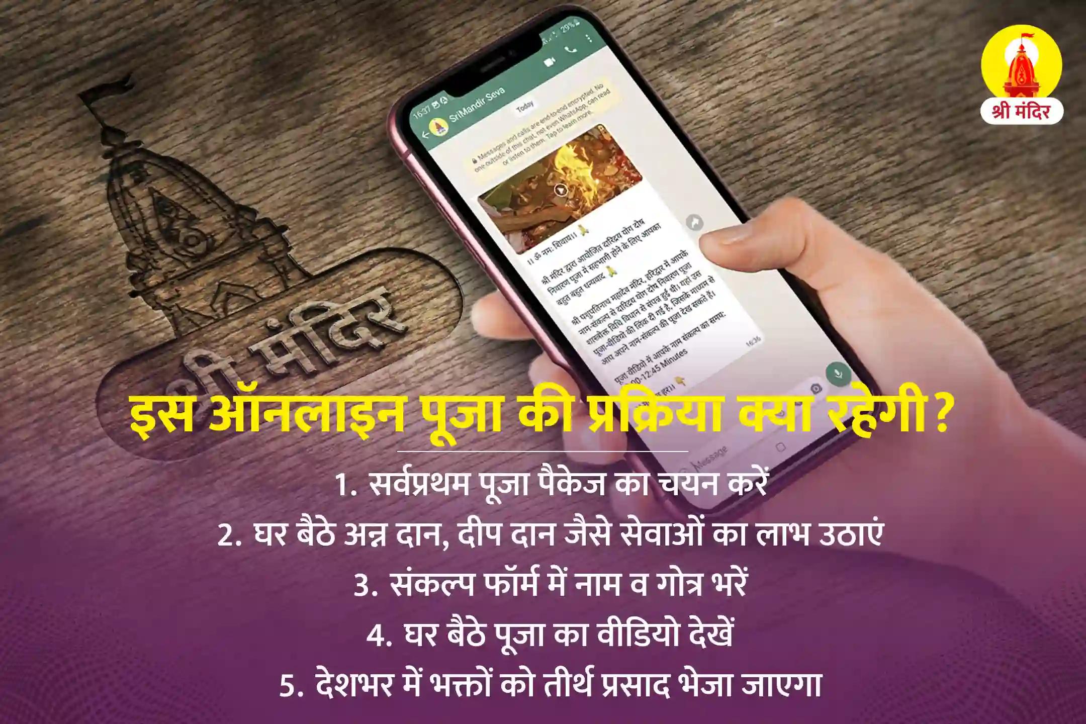 ஸ்ரீ மந்திர் ஒரு நம்பகமான பக்தி தர அடையாளம் ஆகும், இங்கு நாங்கள் மேற்கொள்ளும் ஒவ்வொரு பூஜையையும் இந்து சாஸ்திரங்களின்படி செய்கிறோம். கோவிலின் எங்கள் அனுபவம் வாய்ந்த பண்டிதர்கள், உங்கள் பெயர் மற்றும் கோத்திரத்தில் வேத சடங்குகளை நுணுக்கமாகச் செய்து, உங்கள் மகிழ்ச்சி மற்றும் வெற்றிக்காகப் பிரார்த்தனை செய்வார்கள். சடங்குகள் முடிந்ததும், அனைத்து பூஜை அறிவிப்புகளும் உங்கள் வாட்ஸ்அப் எண்ணுக்குப் பகிரப்படும், மேலும் பூஜையின் காணொலியும் உங்களுடன் பகிரப்படும். அத்துடன், ஒரு தெய்வீக ஆசீர்வாத பெட்டி எந்த கூடுதல் கட்டணமும் இன்றி உங்களுக்கு அனுப்பிவைக்கப்படும். இவை அனைத்தும் 8-10 நாட்களுக்குள் உங்கள் வீட்டிற்கு வந்து சேரும். ஹரி ஓம்.