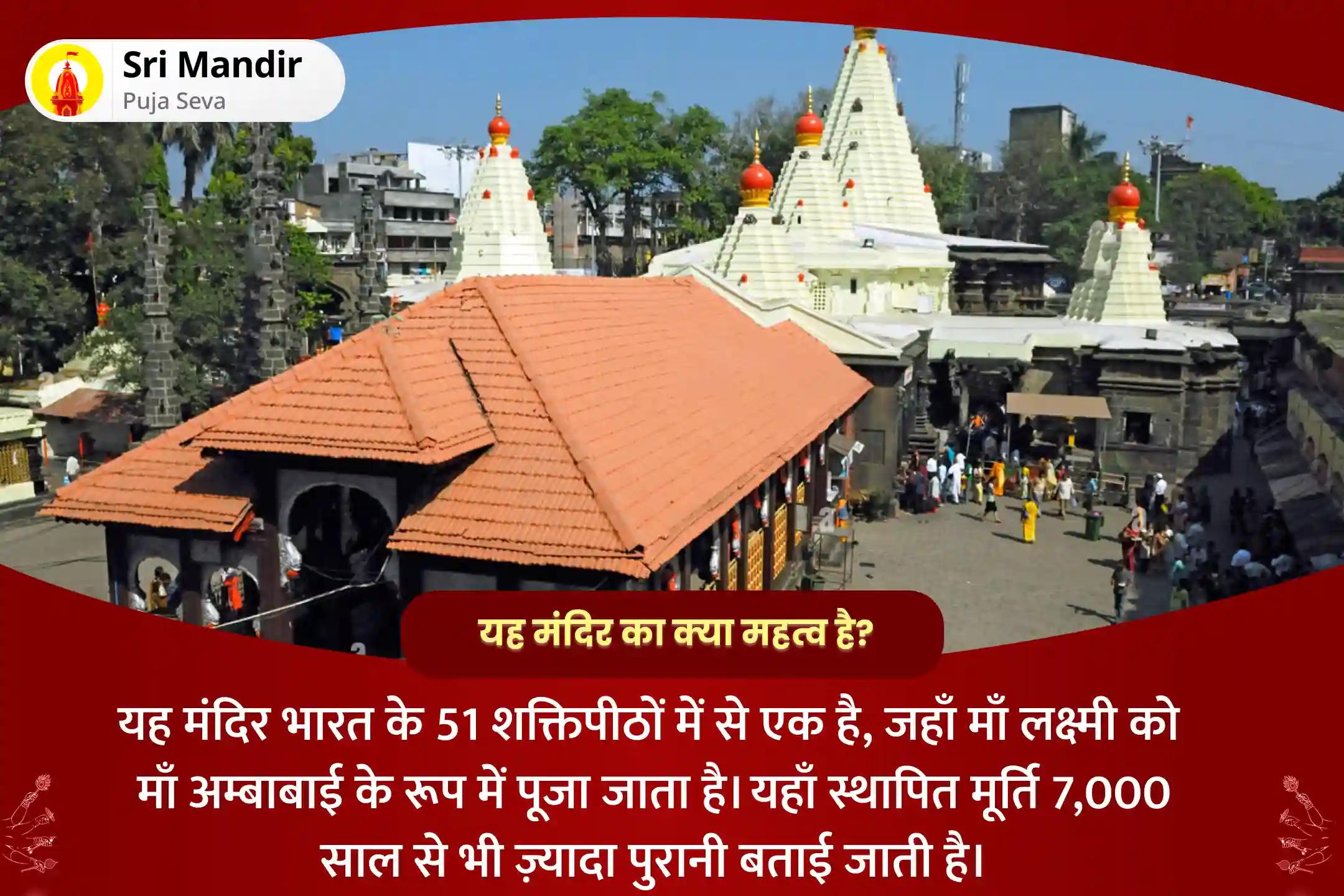 इस मंदिर में विराजित माता लक्ष्मी, अपने भक्तों के घर-परिवार एवं व्यवसाय में पैसे की तंगी तथा दरिद्रता को नष्ट कर देती है। कहते हैं इस मंदिर में सच्चे मन से पूजा-अर्चना करने से माता लक्ष्मी अपने भक्तों की सारी इच्छाएं पूरी करती हैं। यही कारण है कि आर्थिक समृद्धि बनाए रखने के लिए श्री महालक्ष्मी अंबाबाई मंदिर में की जाने वाली पूजा का महत्व अधिक है।